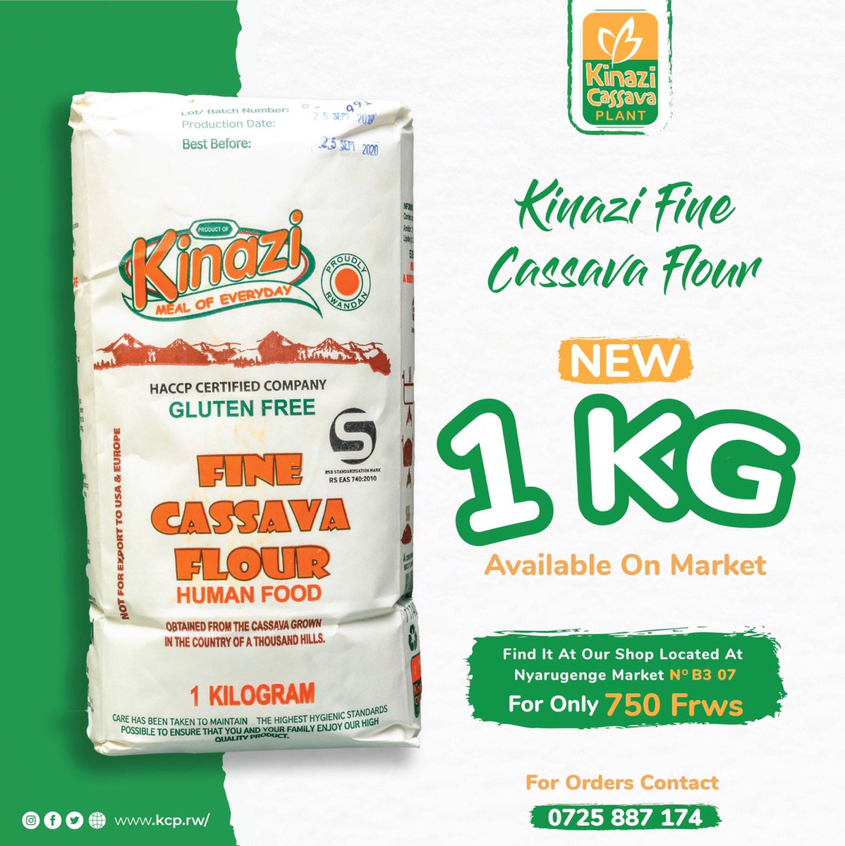 Kinazi Cassava Flour is a fine, premium cassava flour made from fresh cassava tubers grown in Rwanda and processed using wet milling to preserve quality